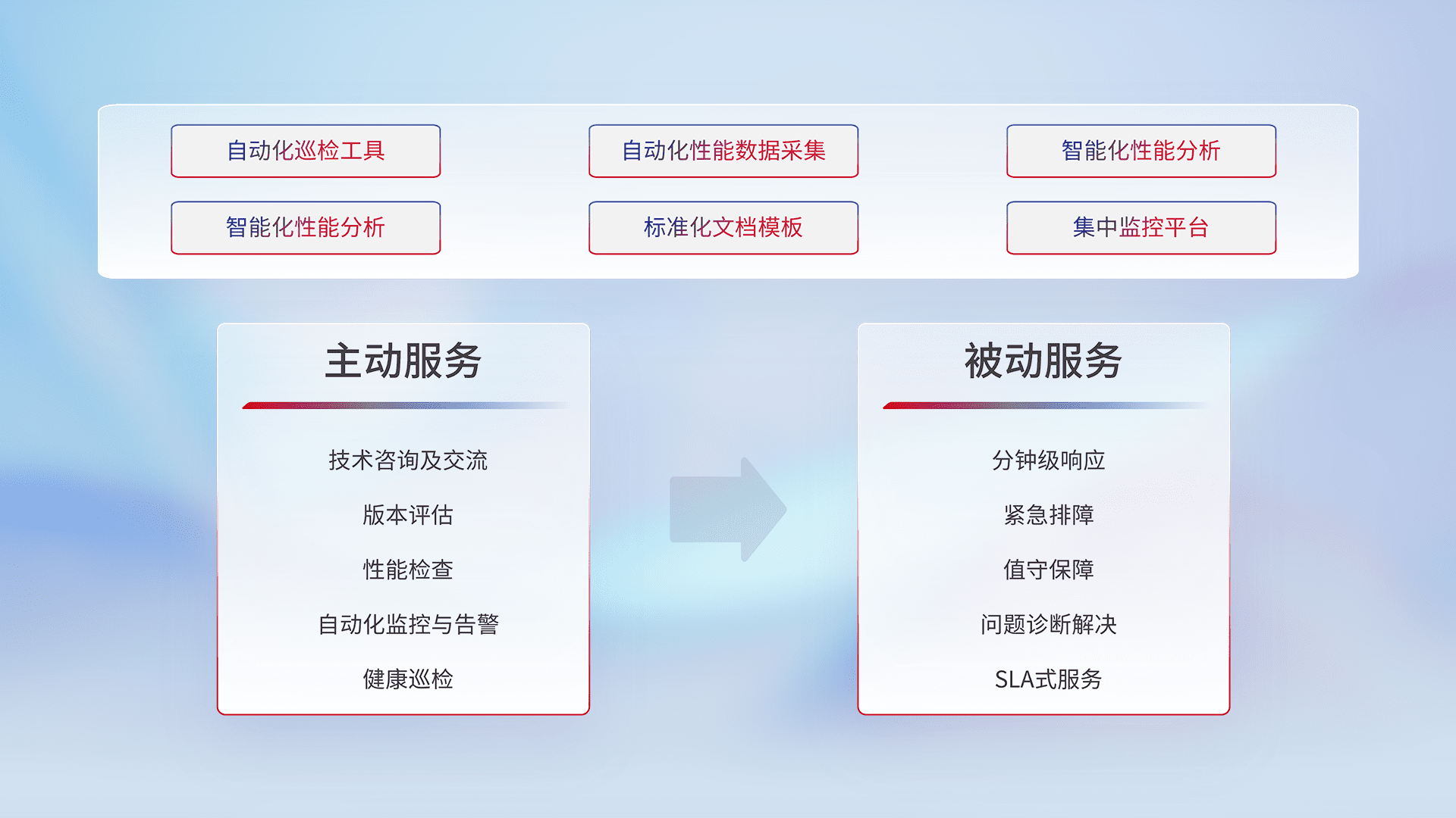 智能化工具和标准化文档,,,保障服务质量,,,提供主动服务(包含技术咨询、、版本评估、、、性能检查、、、自动化监控与告警、、、、健康巡检)和被动服务包含(分钟级响应、、紧急排障、、值守保障、、问题诊断解决、、、、SLA服务)。。