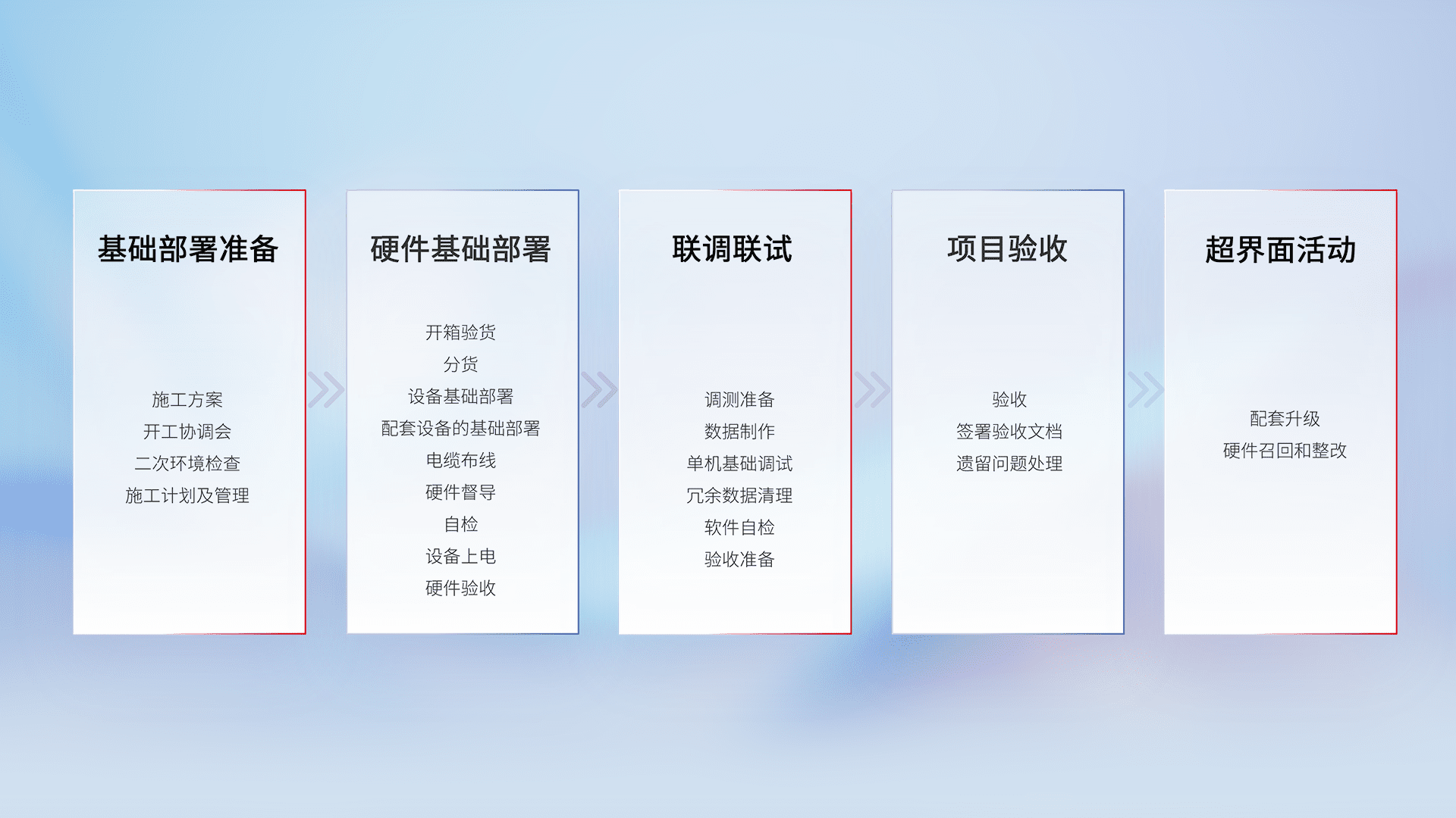 从基础部署准备、、、、硬件基础部署、、、联调联试、、、项目验收、、、、越界面活动的全过程可追溯,,保证施工质量和进度。。。